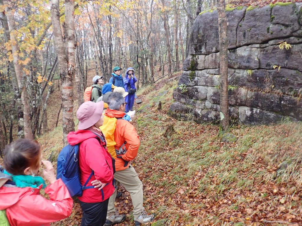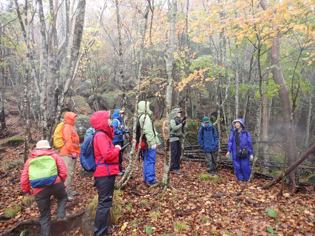 登山道のあちこちには色づき始めたカエデが見られ、足元にもさまざまなカエデの葉が落ちていました。歩きながらそれらを観察し、種類の説明を交えつつゆっくりと登っていきました。途中、登山道沿いのミズナラの大木の中にナラ枯れが見られるものがあり、その様子も参加者に見てもらいました。