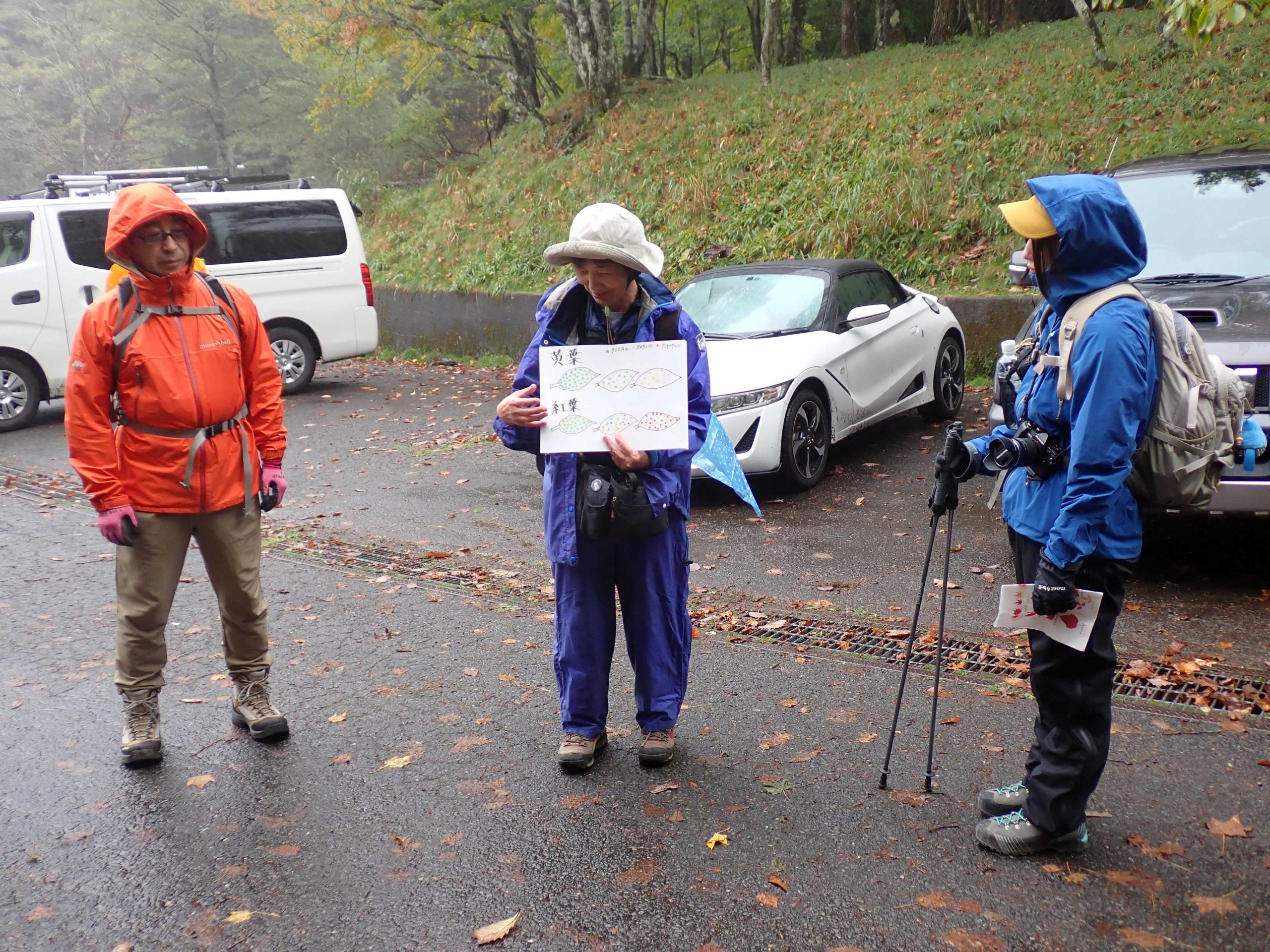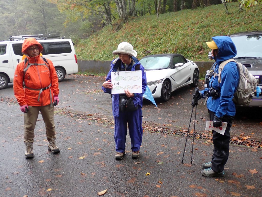 10月25日(土) 秋のトレッキングが開催されました。天気予報は曇りだったため予定どおり実施しましたが、大峠に到着すると霧雨が降っており、雨具を着用しての登山となりました。紅葉は始まったばかり。今回は「紅葉を楽しむ」がテーマだったので、出発前に紅葉のしくみやカエデの種類・見分け方などについて説明を行ってから出発しました。