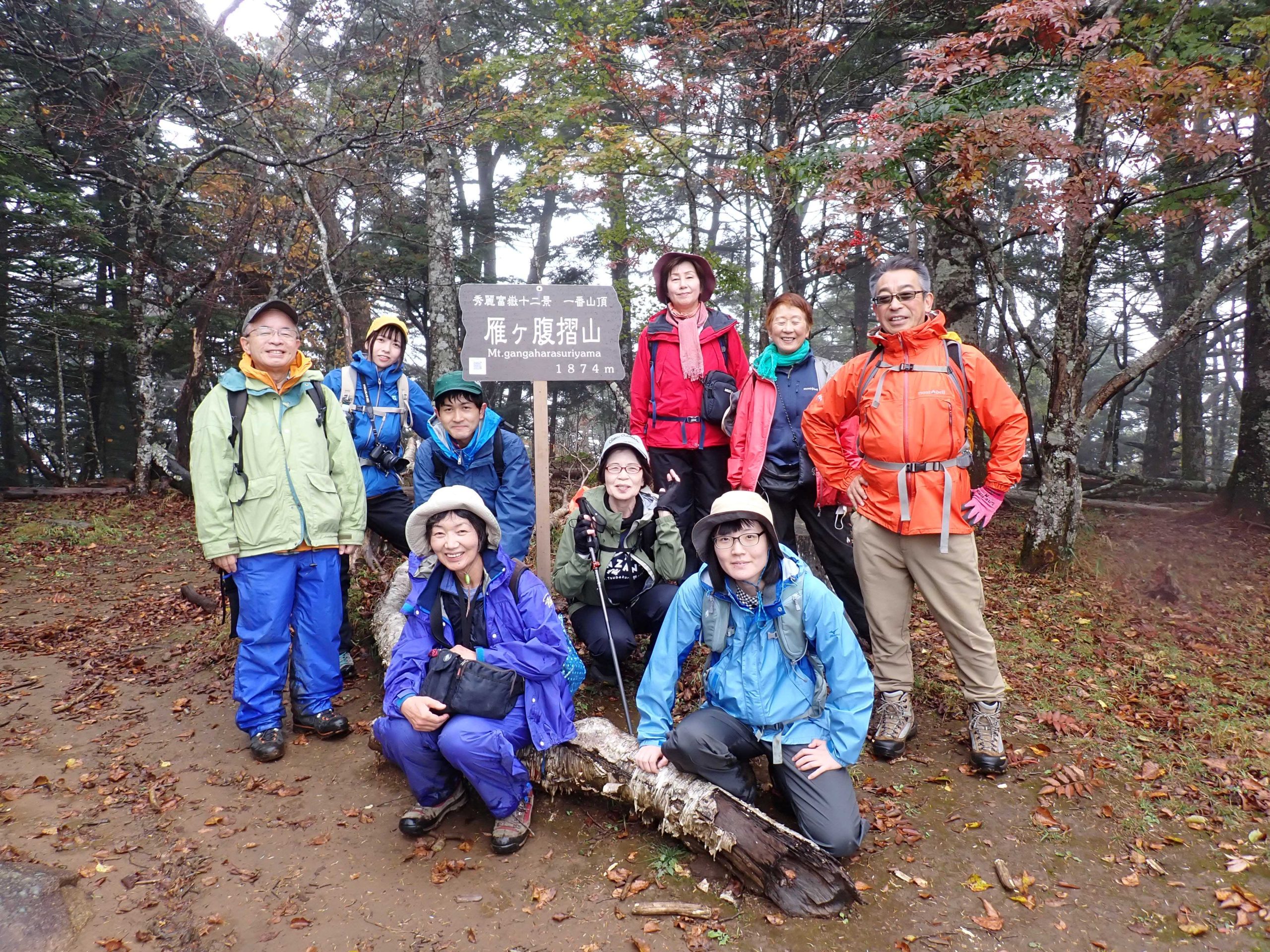 雁ヶ腹摺山に到着したころも霧雨はやまず、空が時おり明るくなるものの展望は得られませんでした。そのため、計画していた大樺ノ頭からシオジの森へのルートはここで断念。山頂でしばらく休憩したのち、雨で滑りやすい道に気をつけながら下山しました。